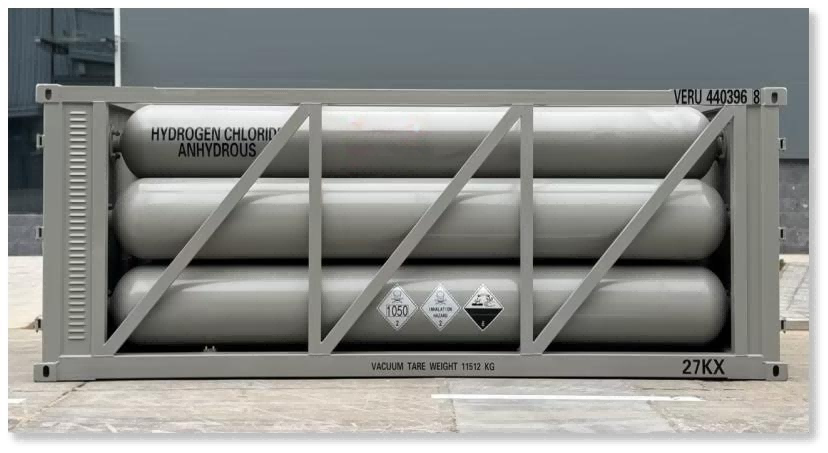 This anhydrous hydrogen chloride (HCl) container-type tube bundle trailer, designed with integrated high-pressure seamless cylinder bundles, meets international standard working pressure, enabling safe and efficient long-distance transportation and storage of anhydrous HCl gas.