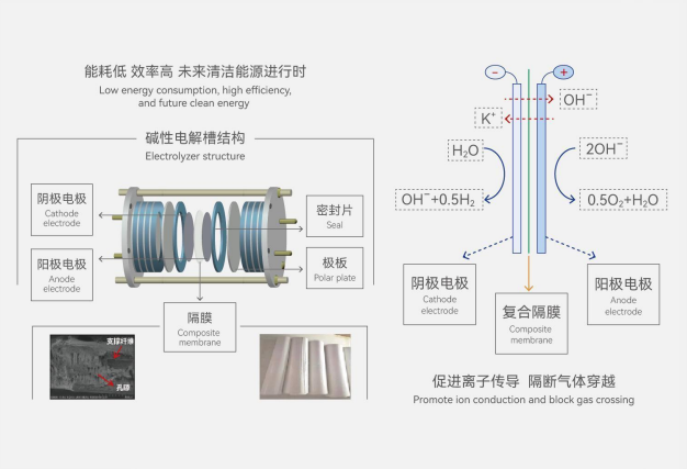The new composite membrane independently developed by CE is composed of organic polymer, ceramic powder and lining support. Widely used in alkaline electrolysis of water, it can efficiently separate hydrogen and oxygen, and pass the electrolyte. It is a breakthrough and innovative product for the key technology in this field.